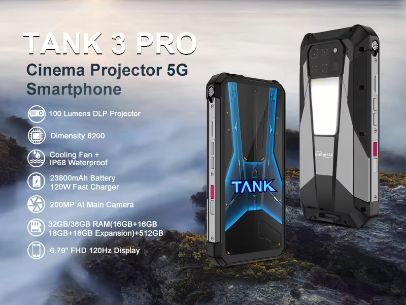 Tank 3 Pro 5G Smartphone robusto com projetor de 100 lumens, ajuste de brilho, tela de 8200Hz, câmera de 64MP com visão noturna e câmera principal de 200MP