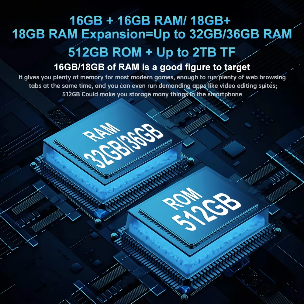 16GB+16GB RAM / 18GB+18GB RAM Expansion = Até 32GB/36GB RAM 512GB ROM + Até 2TB TF 16GB/18GB de RAM é uma boa capacidade a ser almejada. Ela oferece muita memória para a maioria dos jogos modernos, o suficiente para executar várias abas de navegação ao mesmo tempo, e até mesmo rodar aplicativos exigentes, como suítes de edição de vídeo. 512GB de armazenamento pode permitir que você guarde muitas coisas no seu smartphone.